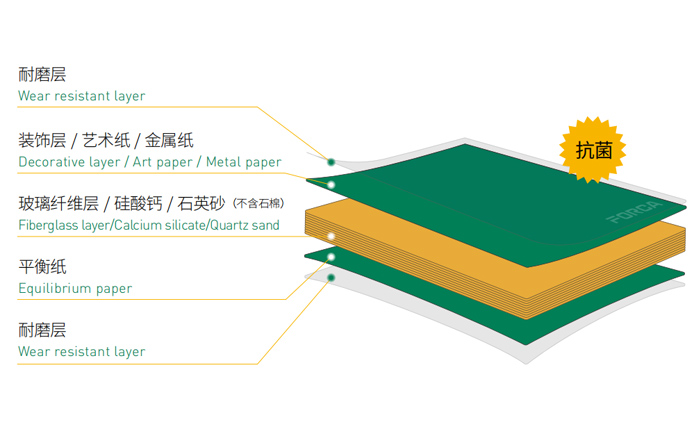 • 福爾卡?醫(yī)耐板?(玻纖復(fù)合不燃板)是由耐磨層、裝飾層、玻璃纖維層、硅酸鈣、石英砂(不含石棉)和平衡紙,表面經(jīng)過(guò)三聚氰胺樹(shù)脂與特種改性樹(shù)脂浸漬層疊后高溫高壓而成,產(chǎn)品的密度不低于1650KG/m3,厚度從4mm 到12mm,形成了整體A級(jí)防火、密度高、硬度高、表面毛孔很小的纖維板。